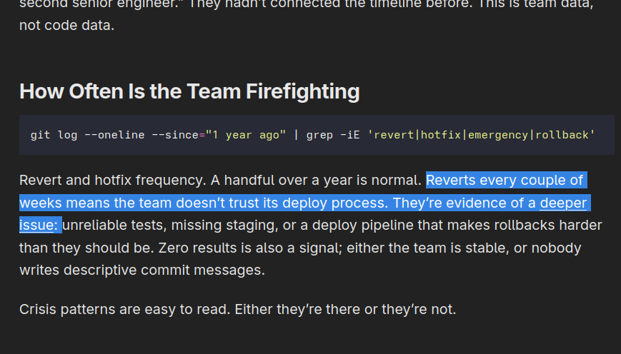 I liked "The #Git Commands I Run Before Reading Any Code" post[1], but during the part that contains "Reverts every couple of weeks means the team doesn’t trust its deploy process. They’re evidence of a deeper issue: […]" something in me yelled: "This is more nuanced, and people will be drawing the wrong conclusions if they believe this blindly".