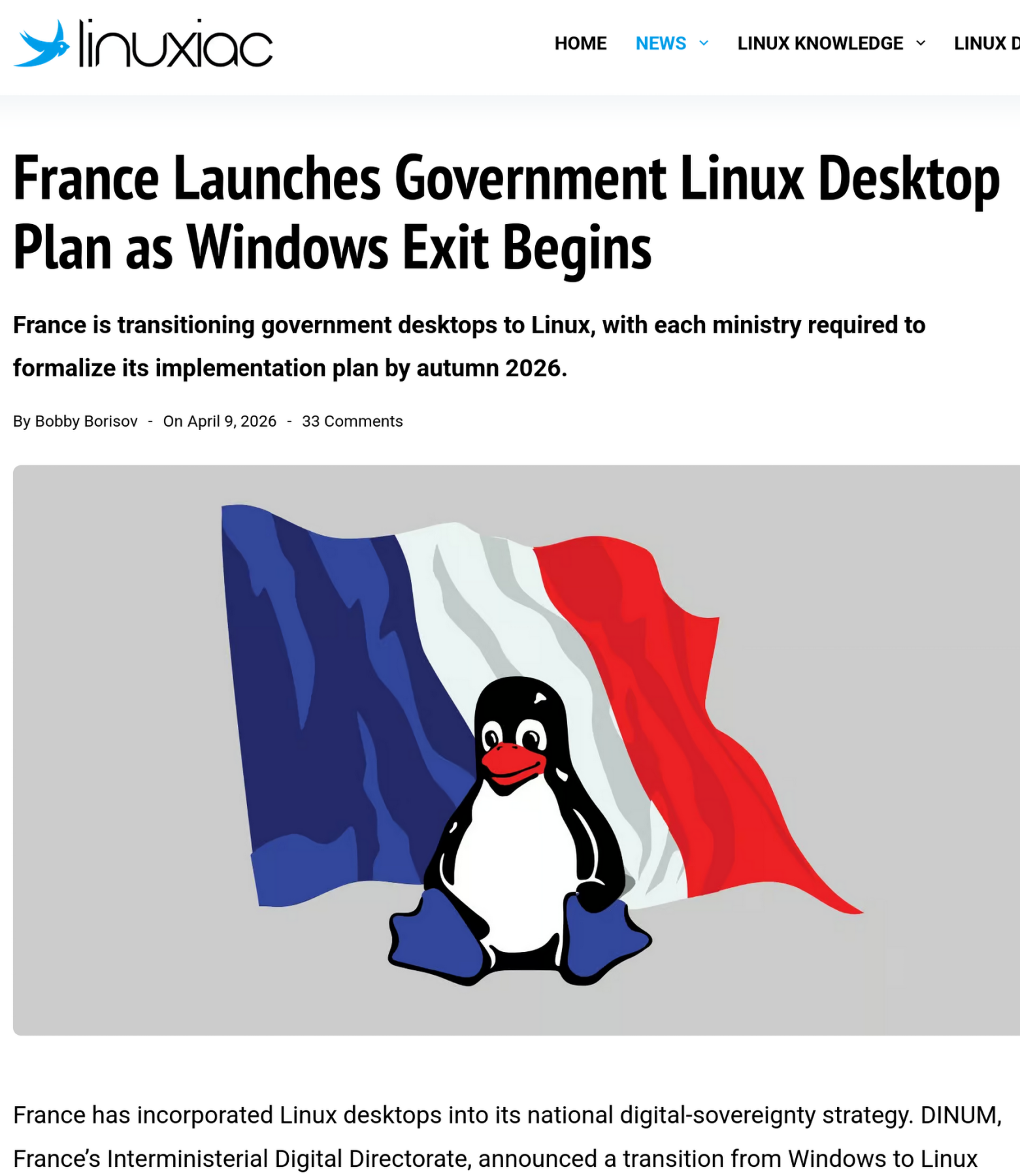France is transitioning government desktops to Linux, with each ministry required to formalize its implementation plan by autumn 2026.