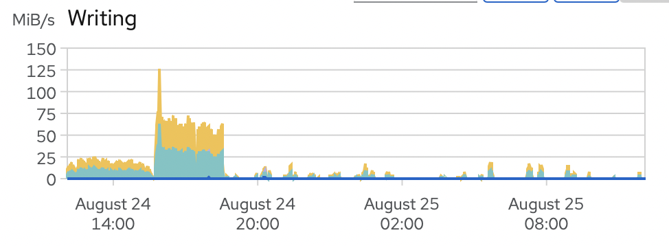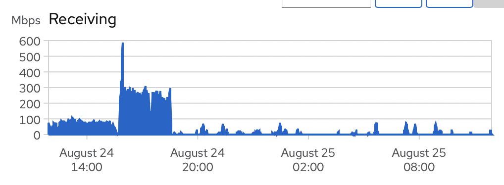 First 24 hours after upgrading my home server from CentOS 7 to RHEL10 (Red Hat Enterprise Linux) and configuring a modern Samba share as target for Apple Time Machine backups, replacing the old AFP (Apple Filing Protocol) based setup. You can see the initial backups taking quite some time and network traffic, but after that the hourly backups just cause little spikes. Nice!