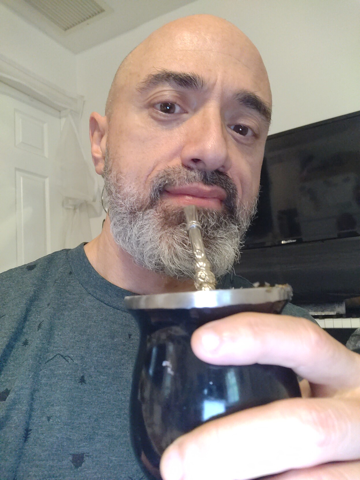 Enjoying my #mate this morning after breakfast, while Ms. A enjoys her Nespresso #coffee. 🧉☕🍳 (cw: scary morning selfie, ec