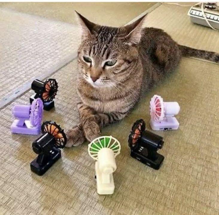 His #Caturday is the same as mine - hot! So he has stolen all the little fans to keep himself cool.