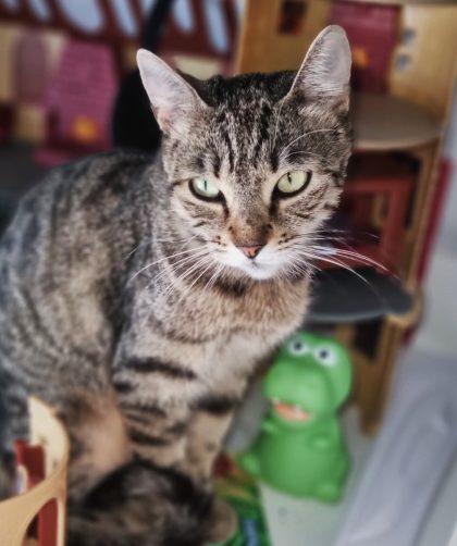 NÎMES – Kinder est une petite chatonne câline et sociable. Elle vit avec Tigrou, Fantômas et Bella.