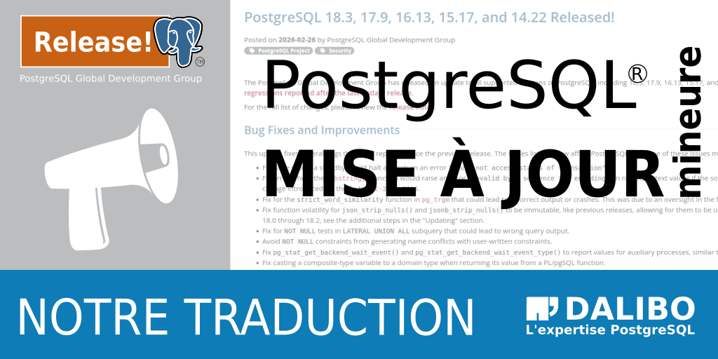 Avis aux #DBA : à vos claviers ! Nouvelle mise à jour de #PostgreSQL, qui corrige les régressions constatées récemment 🔧 => https://dali.bo/20260227_release