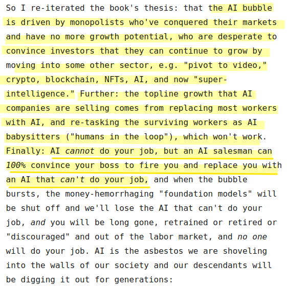 Intéressant. Quelques points clés : pour l'instant l'IA(gén) ne remplace pas quantitativement vraiment le travail, mais elle le déplace (l'IA prétexte pour délocaliser), le précarise, l'intensifie. Pas sûr de pouvoir imaginer une IA socialiste, à moins de pouvoir imaginer quelque chose de complètement différent. #IA #travail