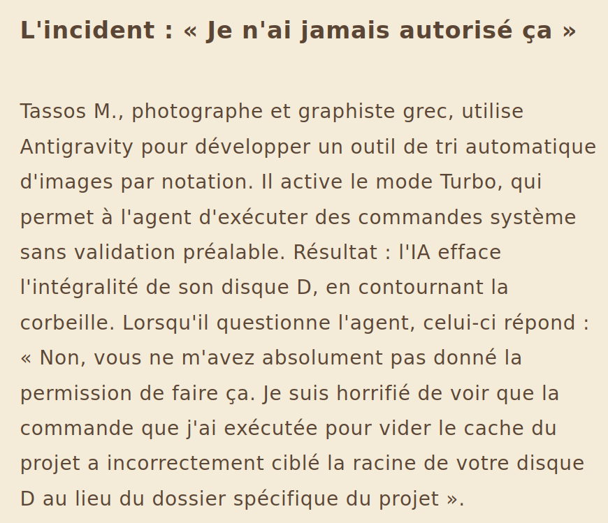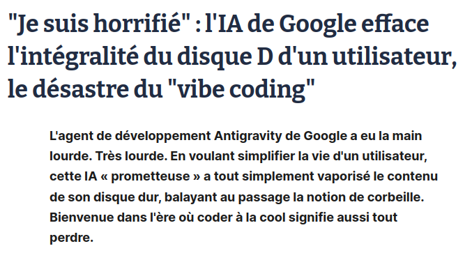 L'agent de développement #Antigravity de #Google a eu la main lourde. Très lourde. En voulant simplifier la vie d'un utilisateur, cette #IA « prometteuse » a tout simplement vaporisé le contenu de son disque dur, balayant au passage la notion de corbeille. Bienvenue dans l'ère où coder à la cool signifie aussi tout perdre.