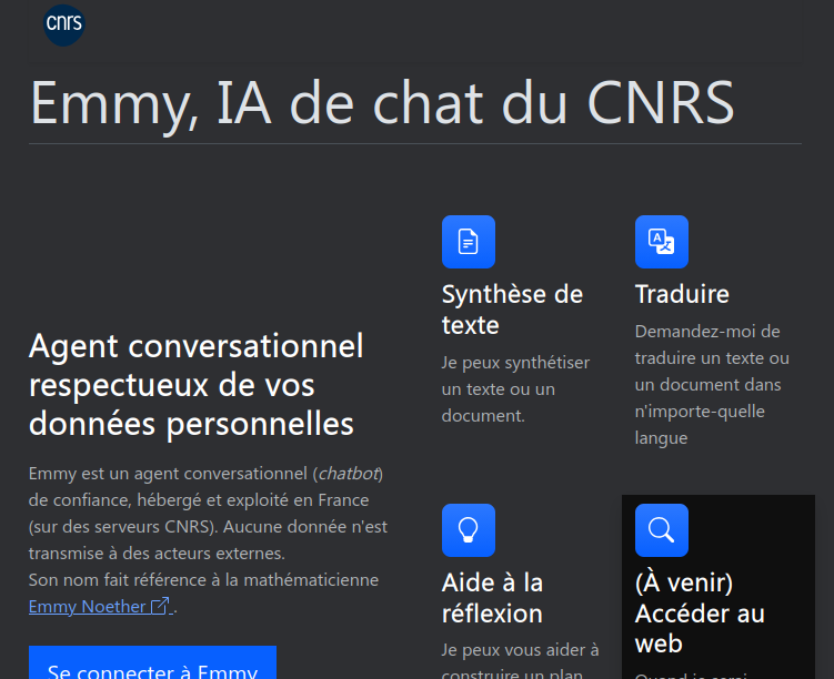 Pour le plus grand déplaisir de tous les gens encore intéressés par l'idée d'utiliser leur cerveau, le CNRS saute à pieds joints dans la mare de vomi de LLM, et propose *sa version*, accompagnée d'exemple de ce qu'elle peut faire, comme « Faire une synthèse d'un texte » ... 🙄