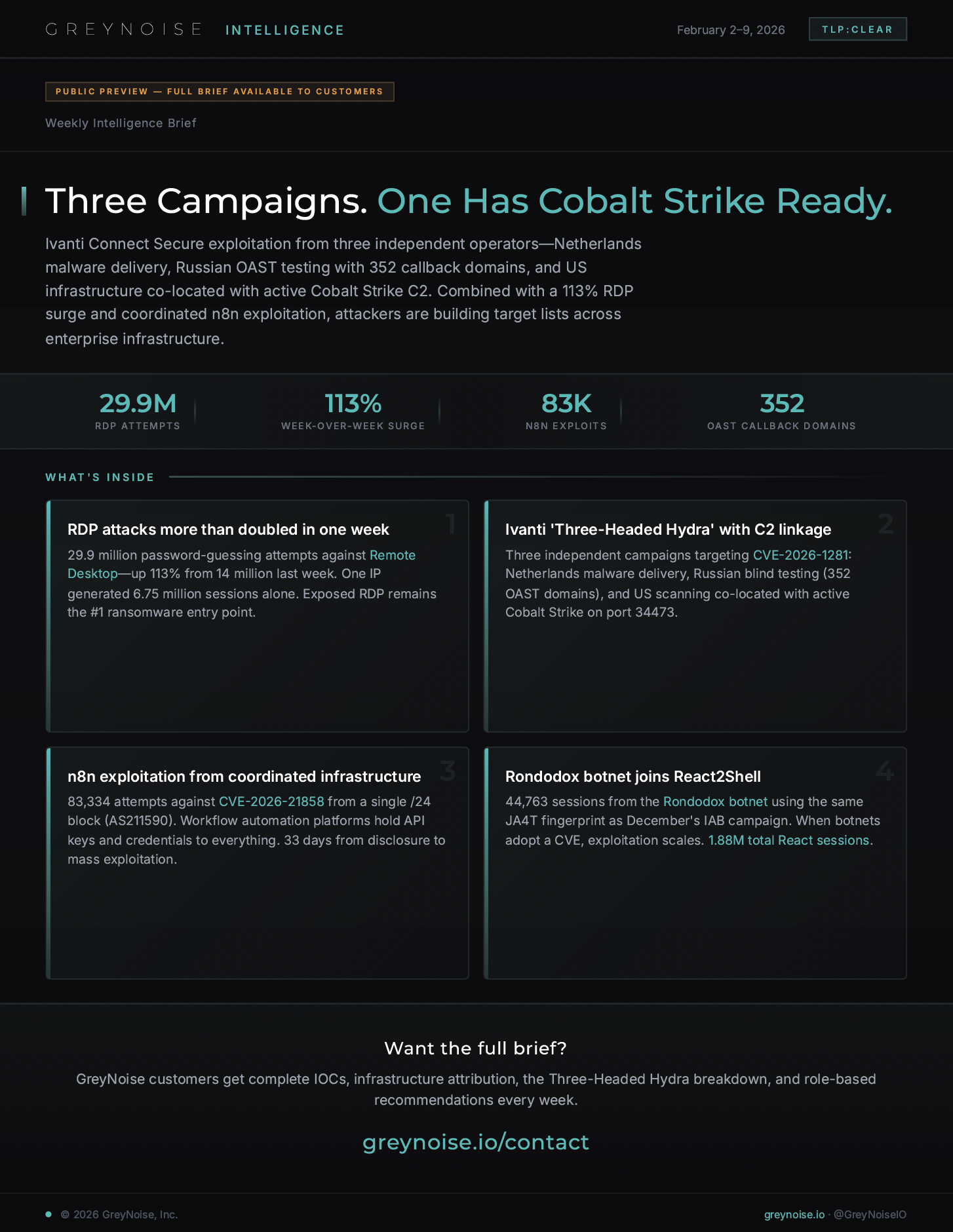 A preview of what GreyNoise customers get every week. Full brief has the IOCs, attribution, and analysis.