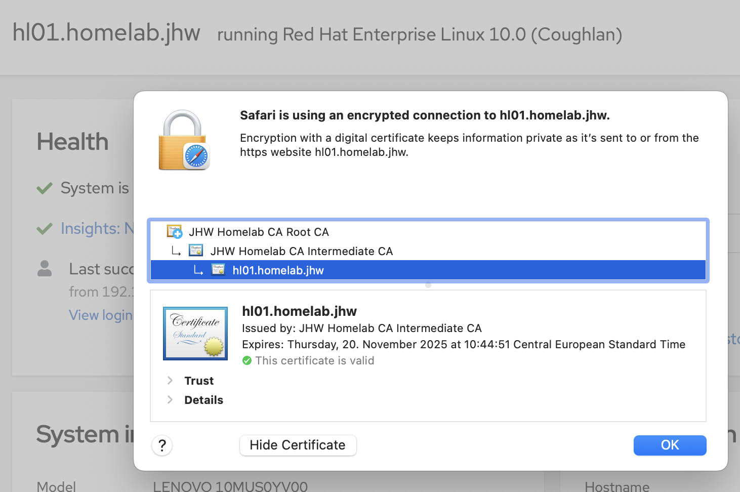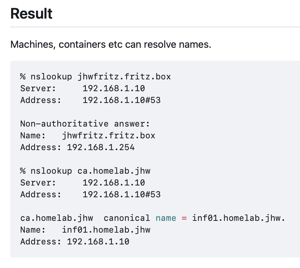 #ItsAlwaysDNS I took the plunge. Configured my Fritz Box to hand out my new DNS server to all DHCP devices. So now DNS requests go first to my BIND9, which resolves homelab.jhw. If it can't answer, it forwards to the Fritz Box, who takes care of the local fritz.box domain. And if that doesn't work it goes out to the internet. Seems to work :) I can now reach my homelab machines under their homelab.jhw name and with a valid certificate. Yay! Updated the gist too.