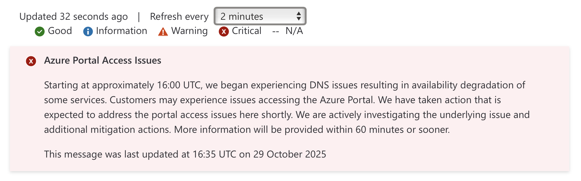 UPDATE: They have now changed the wording to "we began experiencing Azure Front Door issues resulting in a loss of availability of some services" and the impact is now CRITICAL — Azure Network Availability Issues on a global level.