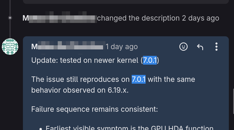 Now it needs a backport to 7.0, as it does not apply cleanly there. Luckily, Thomas apparently plans to provide one; sadly, it will most likely be too late for #LinuxKernel 7.0.1, which is already in testing.