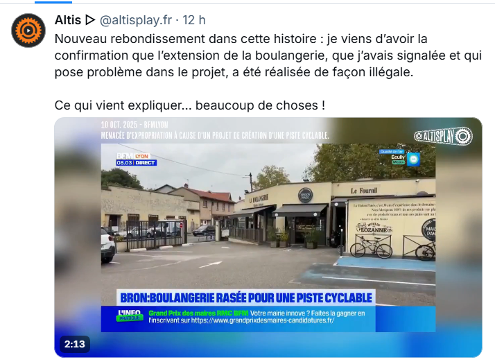 - des journaleux locaux ont fait moults articles sur un mytho (ex https://www.20minutes.fr/societe/4178450-20251011-lyon-boulangerie-rasee-amenagement-piste-cyclable) alors qu'en fait :