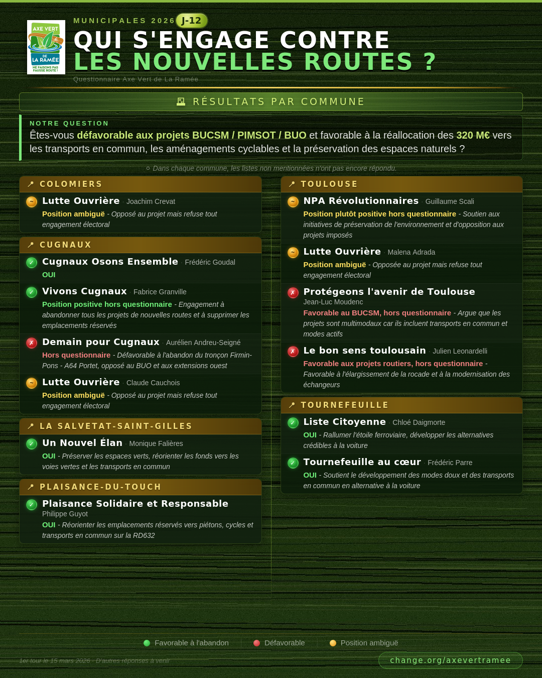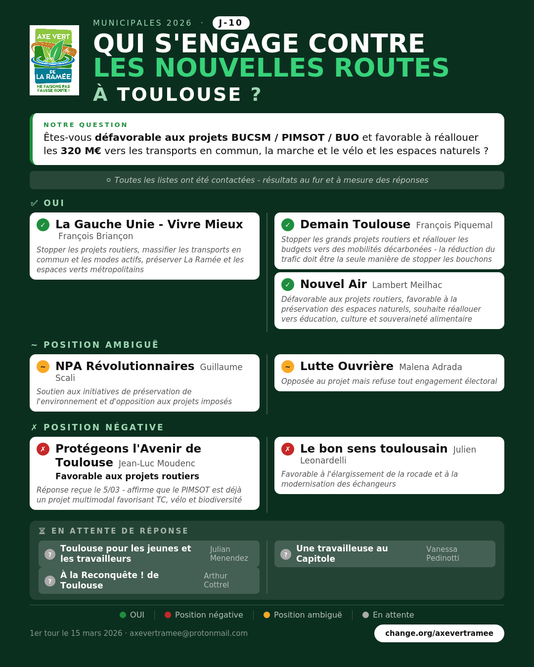 À tous les candidats, que nous n’avons pas encore pu contacter, merci de vous rendre sur https://municipales2026.fub.fr/ et trouver votre commune.