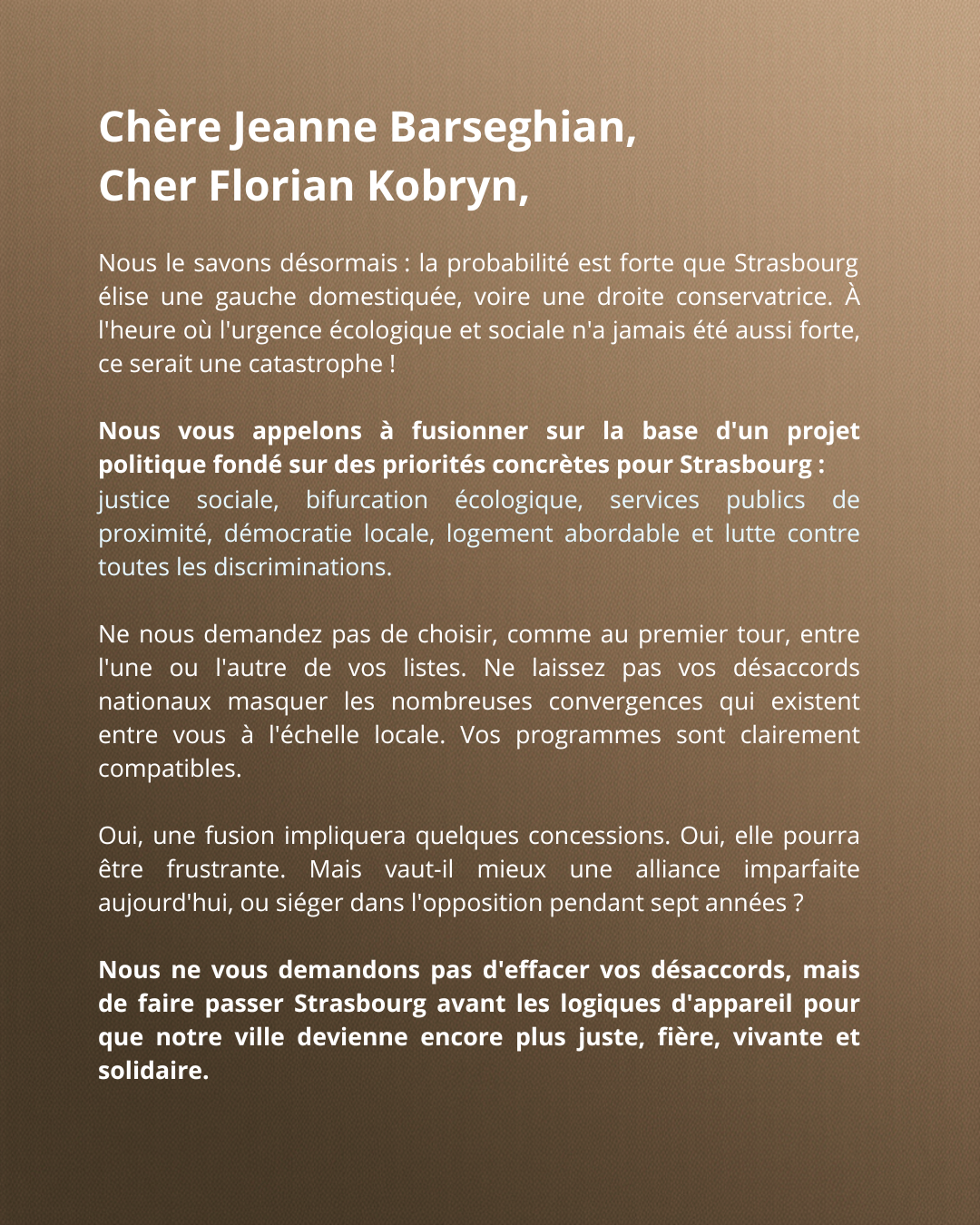 Dans chaque commune où la droite et l'extrême-droite peuvent gagner, l'ensemble des listes de gauche doivent s'unir sur les bases du résultat du premier tour. Toute personne s'y opposant devient de facto un·e allié·e de la droite et de l'extrême-droite. N'en déplaise aux états-majors parisiens totalement déconnectés du terrain