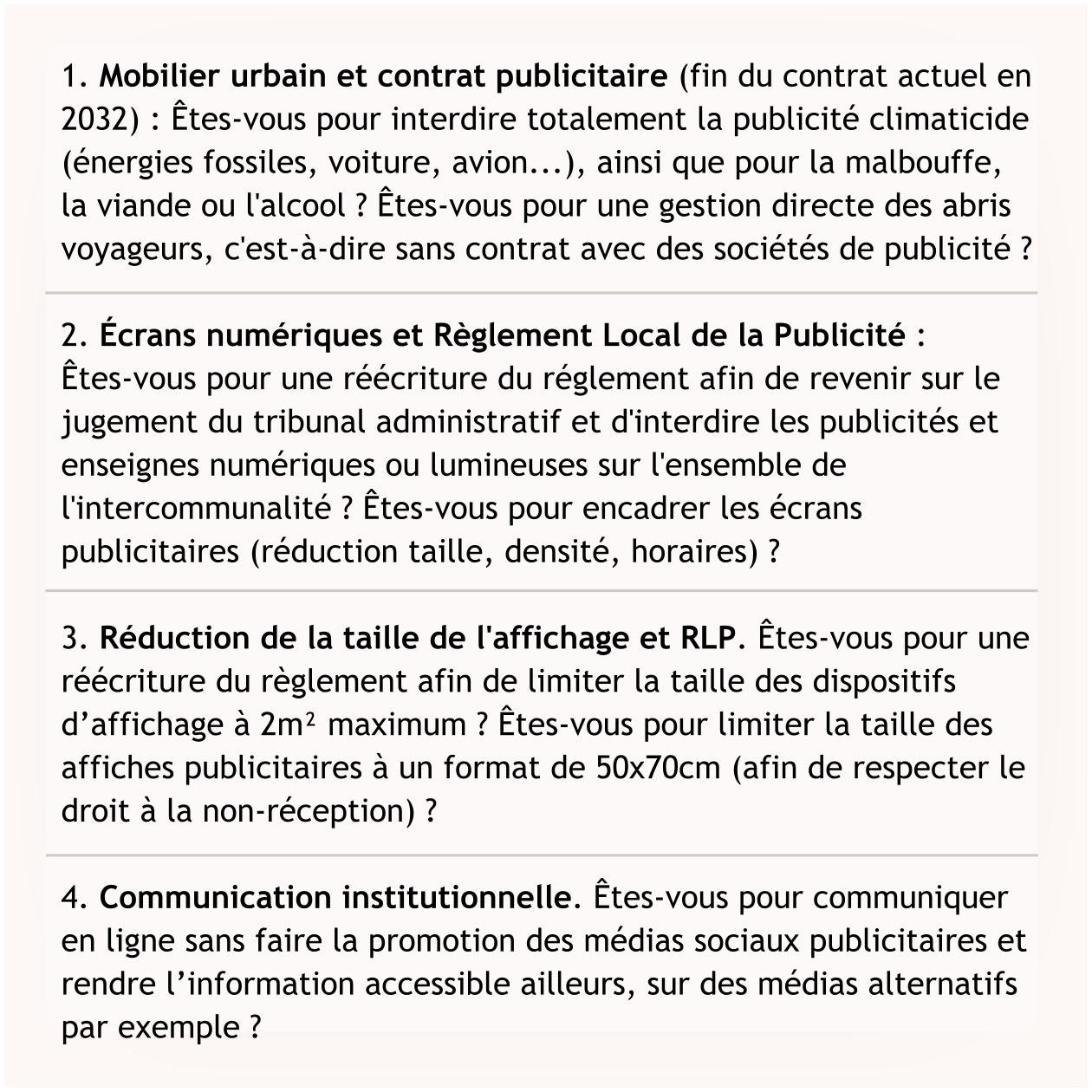 Ça devrait nous permettre d'avoir un cadre de questions identiques pour pouvoir jauger des réponses de chaque liste. Ça me paraît être plus intéressant et efficace que chopper des bouts de phrase sur un tract en A3.