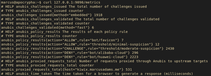 Anybody know if there's a user friendly interface for displaying #Prometheus metrics? I use #Anubis to protect a site and it binds "metrics" to a certain port. I was able to figure out that I can curl the plain text with: