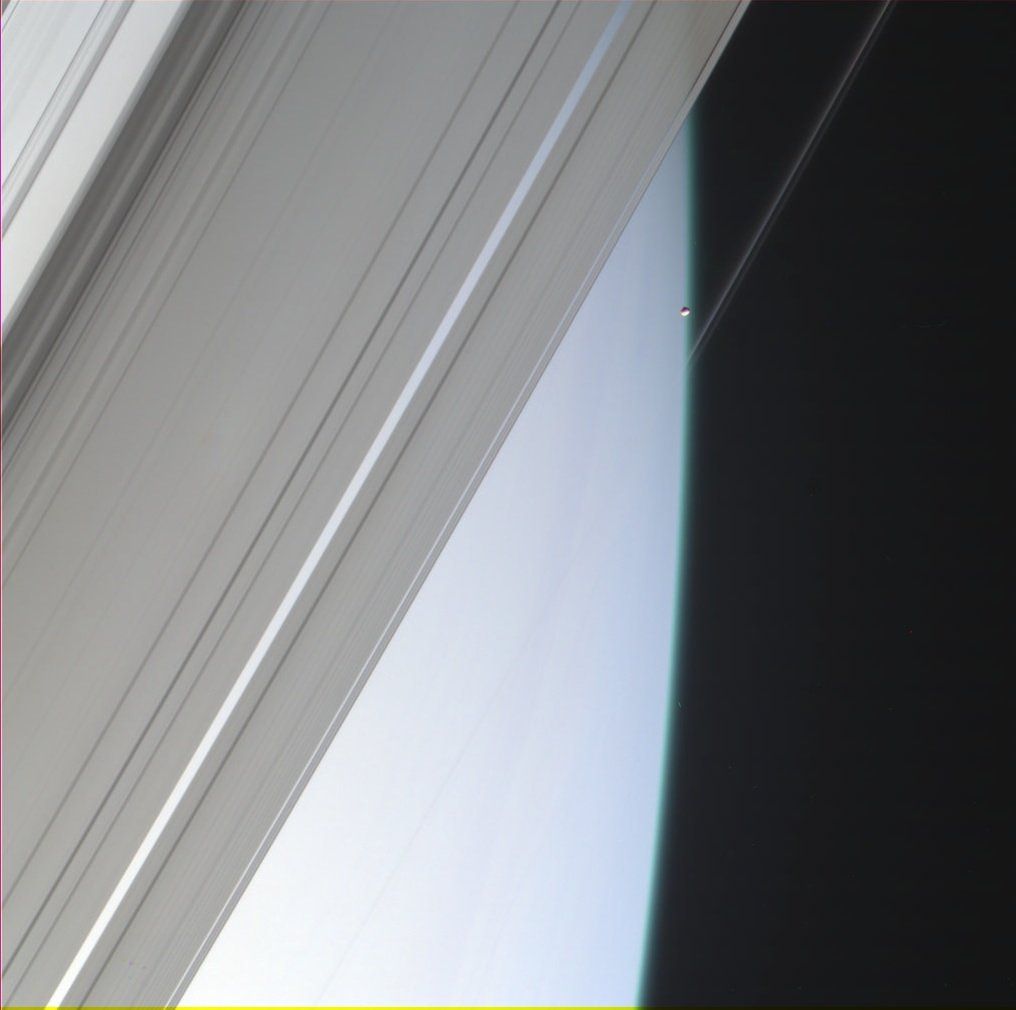 Septième jour de mon #randomctober Ici, c'est le satellite "berger" nommé Prometheus que l'on voit, au sein d'une des dernières division des anneaux de Saturne. Instrument Narrow Angle Camera, RGB, le 14 Avril 2007.