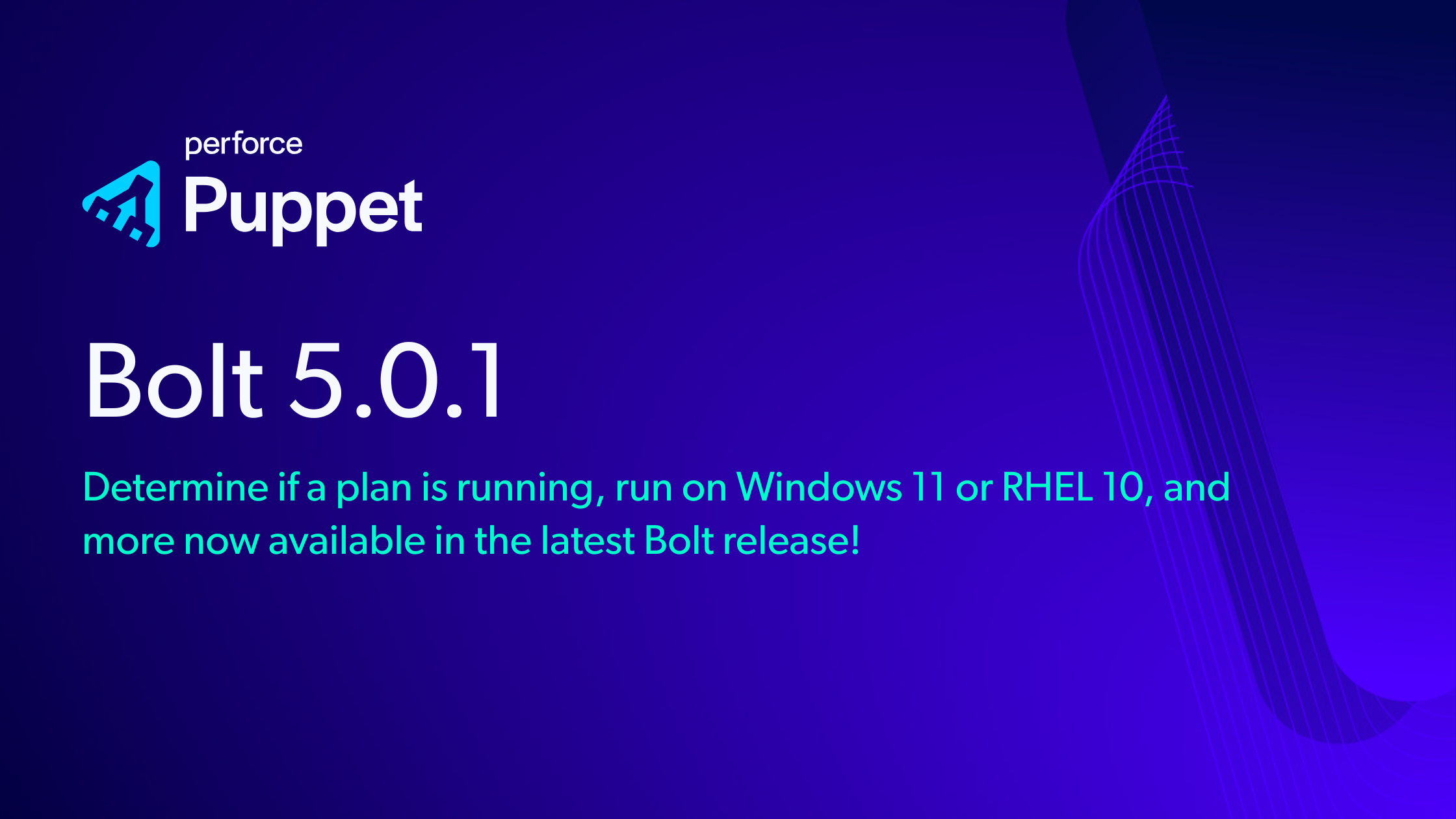 You can now install Bolt 5.0.1 which brings a new plan_context function to get information about whether a plan is running in Bolt or Puppet Enterprise. Windows 11 and RHEL 10 support were also added!