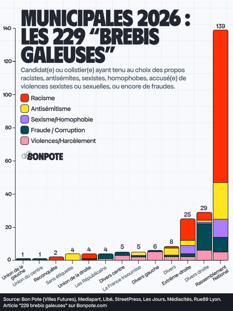 Puisque apparemment, il faut rappeler qui est qui, @bonpoteofficiel a listé 229 brebis galeuses parmi les candidats des municipales 2026. Propos racistes, antisémites, sexistes, homophobes, VSS ou encore fraudes. Chaque cas est sourcé, grâce à un travail collectif de nombreux médias.