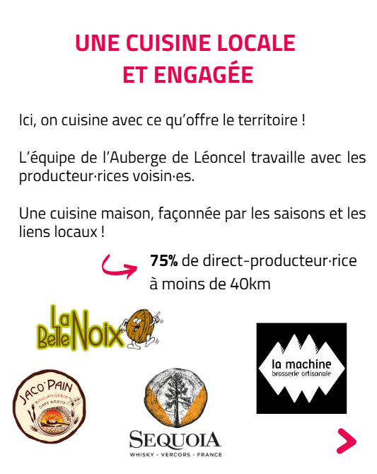 Au cœur du Vercors, l’équipe défend une restauration ancrée dans le territoire : 75 % des approvisionnements en direct-producteur, tous situés à moins de 40 km. Une structure qui fait vivre son territoire !