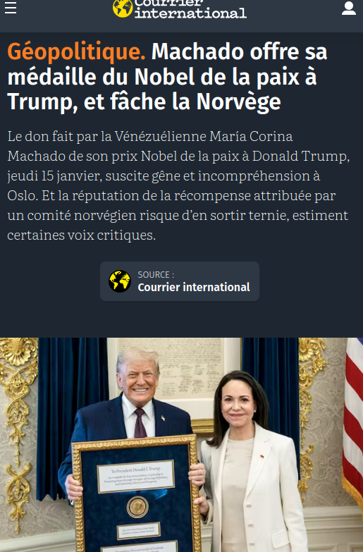 Le comité #Nobel a été obligé de signifier à #Machado qu'elle ne peut ni "partager" ni "remettre" son prix à #Trump (pour le remercier d'avoir kidnappé #Maduro et bombardé son pays, provoquant une centaine de morts).