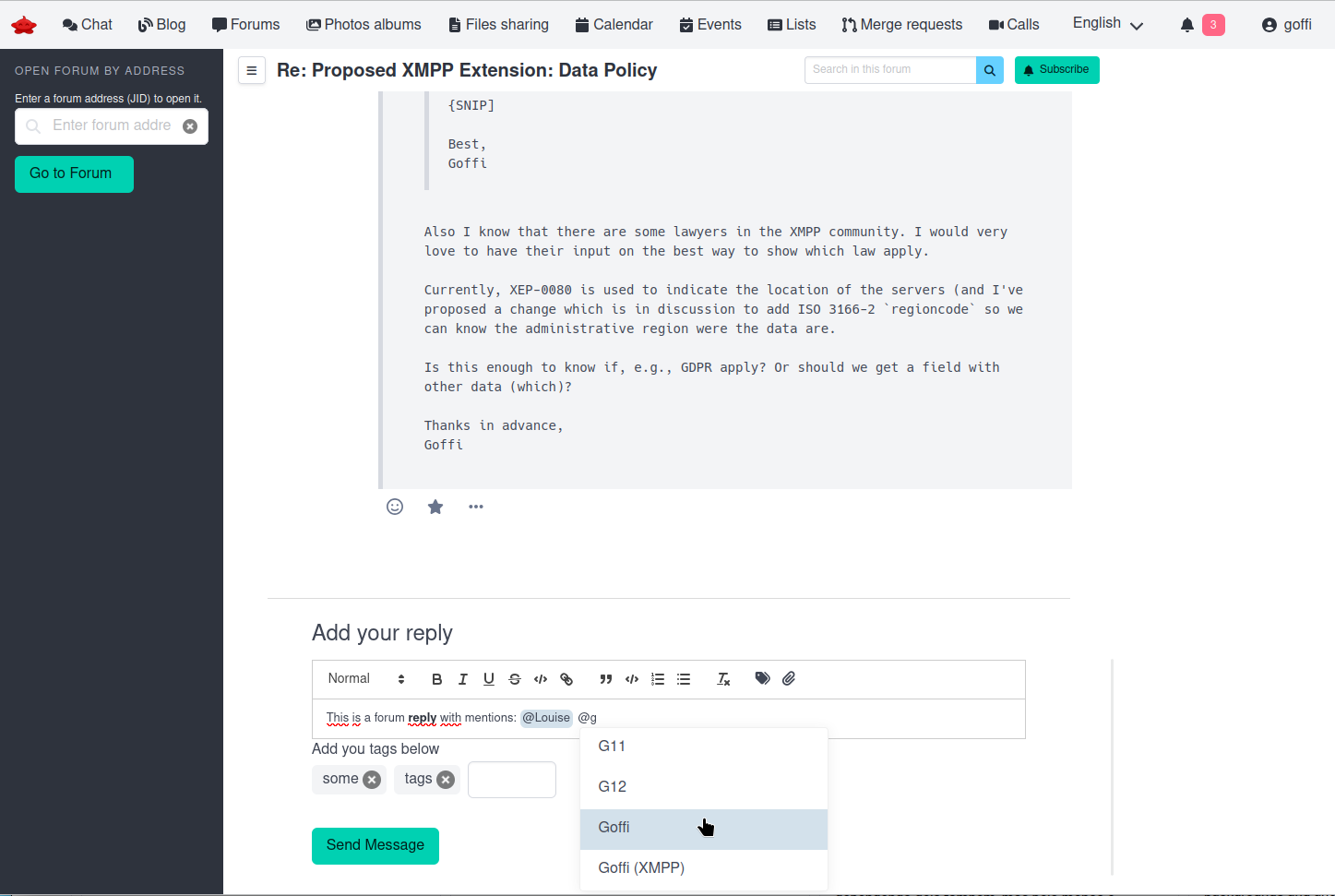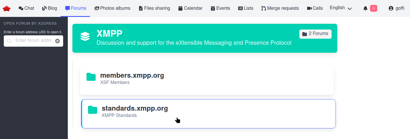 Here is the capture of the tree-like hierarchy of pubsub nodes I talked about yesterday, but this time rendered as forum categories in Libervia web. I’ve added an "XMPP" category and set descriptions (all part of pubsub node metadata). All of this benefits from pubsub permission and subscription mechanisms.