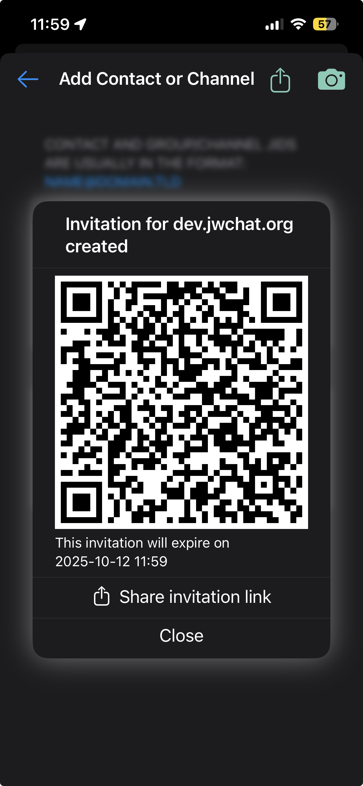 Habe dabei gerausgefunden, daß der standart QR-Scanner von iOS nicht in der Lage ist, einfach das wiederzugeben, was im QR-Code steht. Nein, es will eine Email an die XMPP-Adresse schicken.